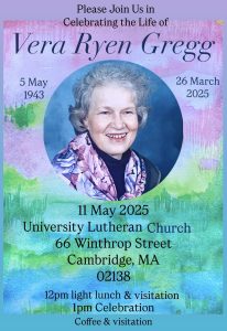 It is with great sadness we post the passing of Vera Ryen Gregg. Vera served our lodge for many years in different roles from lodge librarian to Lodge President, Her insight to all things Norwegian was always educational and interesting. If there was an event at the lodge, Vera was there serving and smiling the whole time. She was a staple assisting at our annual Scandinavian fair, entertaining children at our 17mai family picnics, attending the Brooklyn parade, teaching songs at our annual yuletrefest for barn and many other functions, She will be dearly missed by all who knew her.